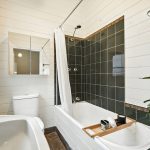 – Stylish bathroom featuring bath/shower, with open laundry area adjacent